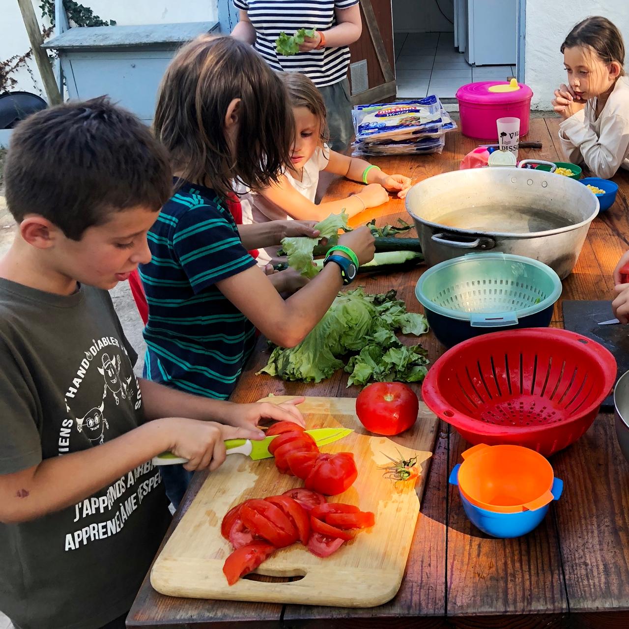 Les repas sont confectionnés sur place par l’équipe avec la participation des enfants dans la mesure du possible. Des menus simples et équilibrés qui plaisent aux enfants, qui favorisent au maximum des produits frais et de saison, ainsi que des menus adaptés aux différents régimes alimentaires.